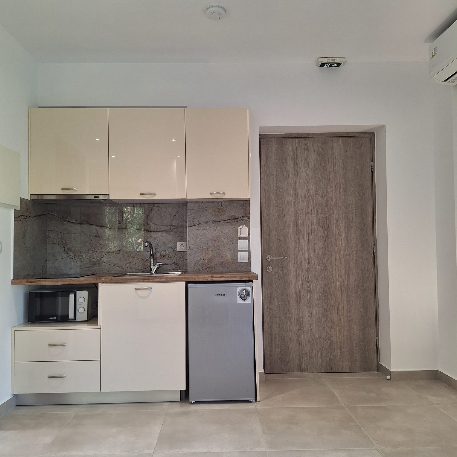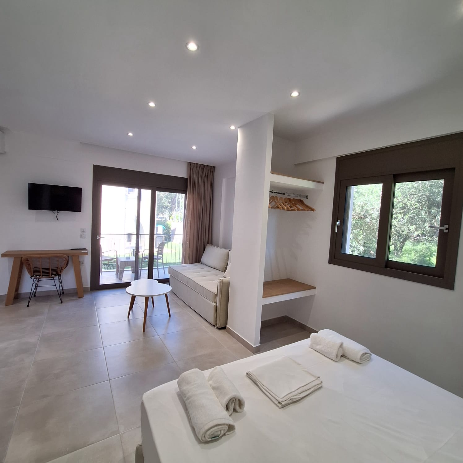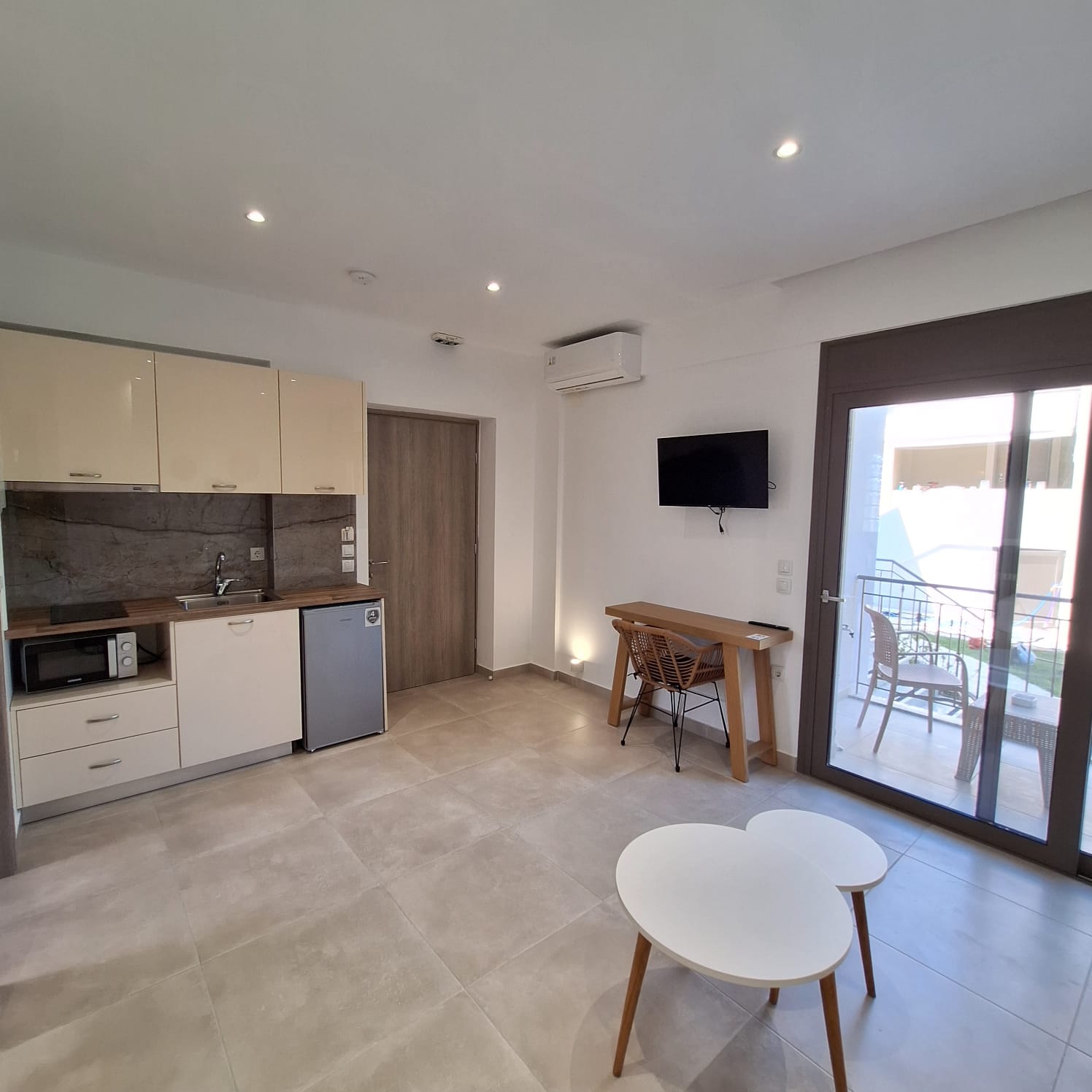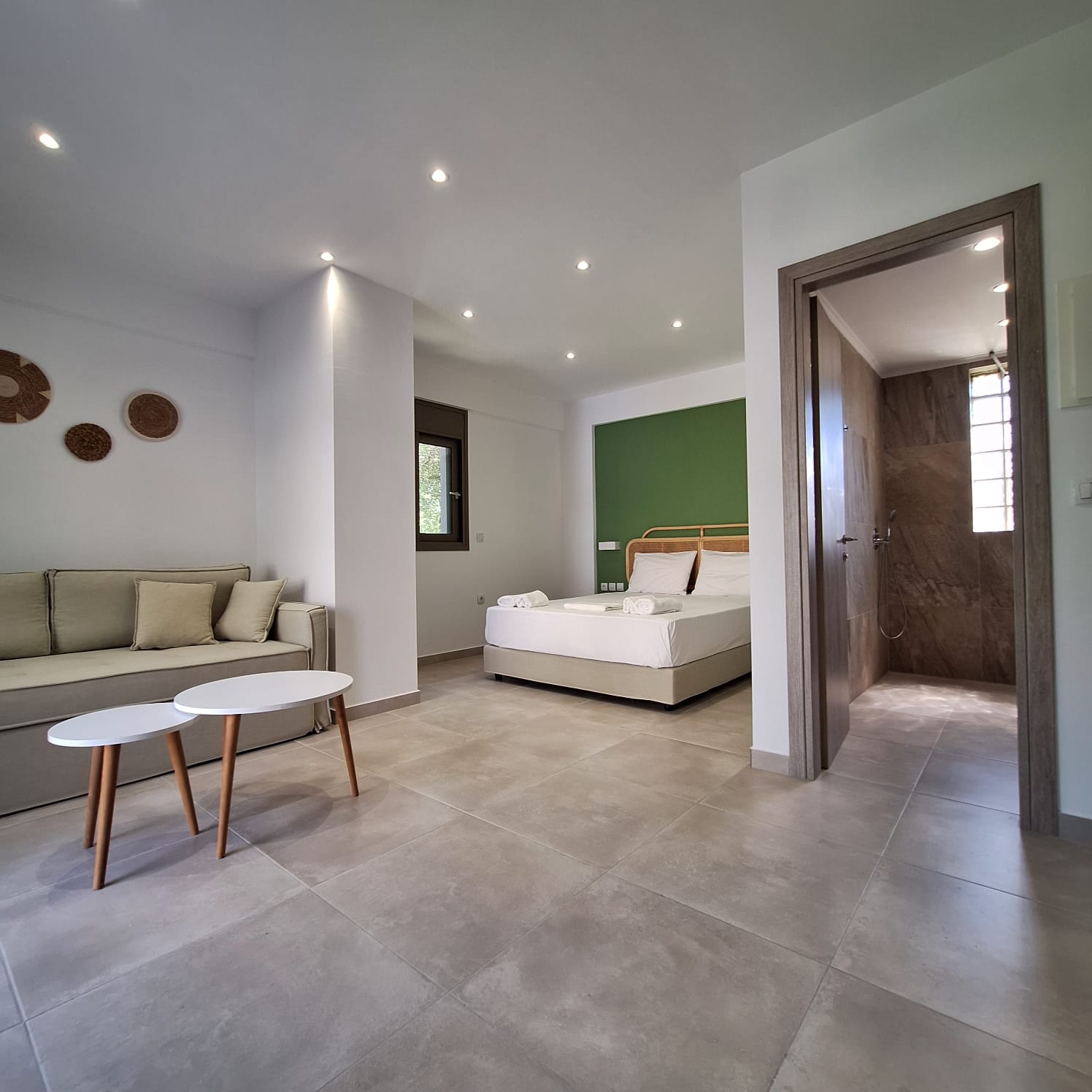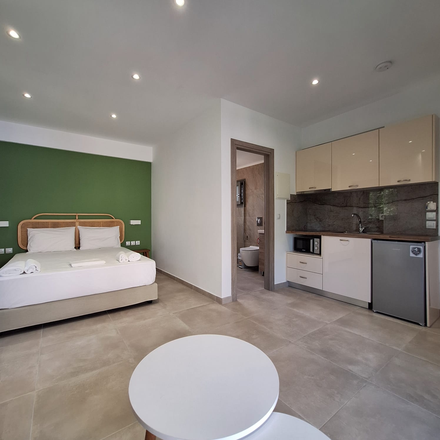 Step into our modern suite, thoughtfully designed to offer comfort, style, and convenience.This open-plan space features a fully equipped kitchen, one comfortable double bed, a sofa-bed, air conditioning, complimentary WiFi, and free private parking.