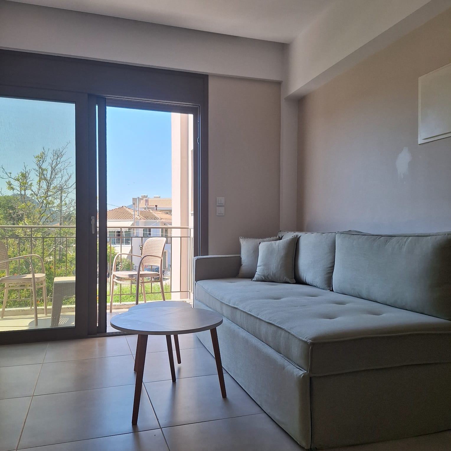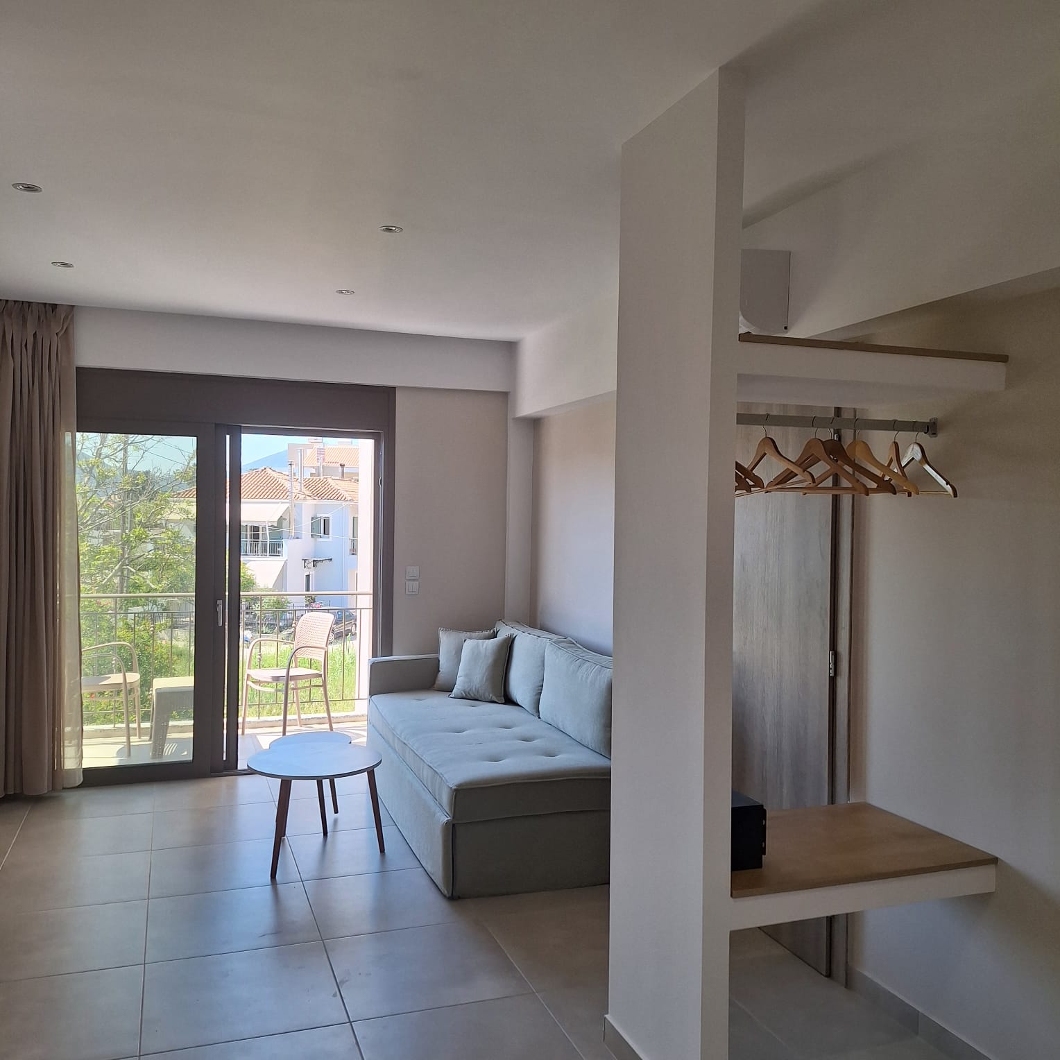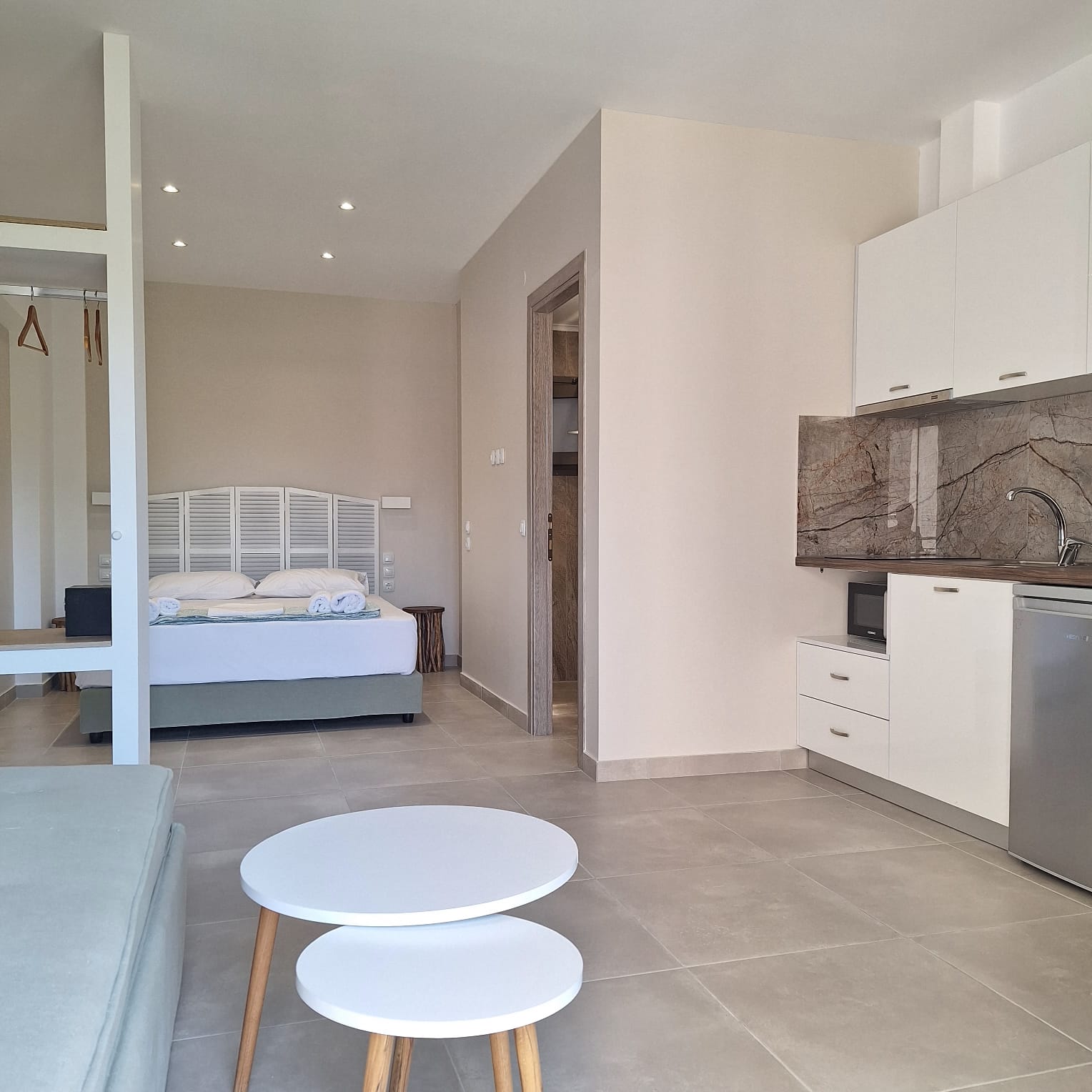 Step into our modern suite, thoughtfully designed to offer comfort, style, and convenience.This open-plan space features a fully equipped kitchen,  a comfortable double bed and a sofa-bed, balcony, air conditioning, complimentary WiFi, and free private parking.