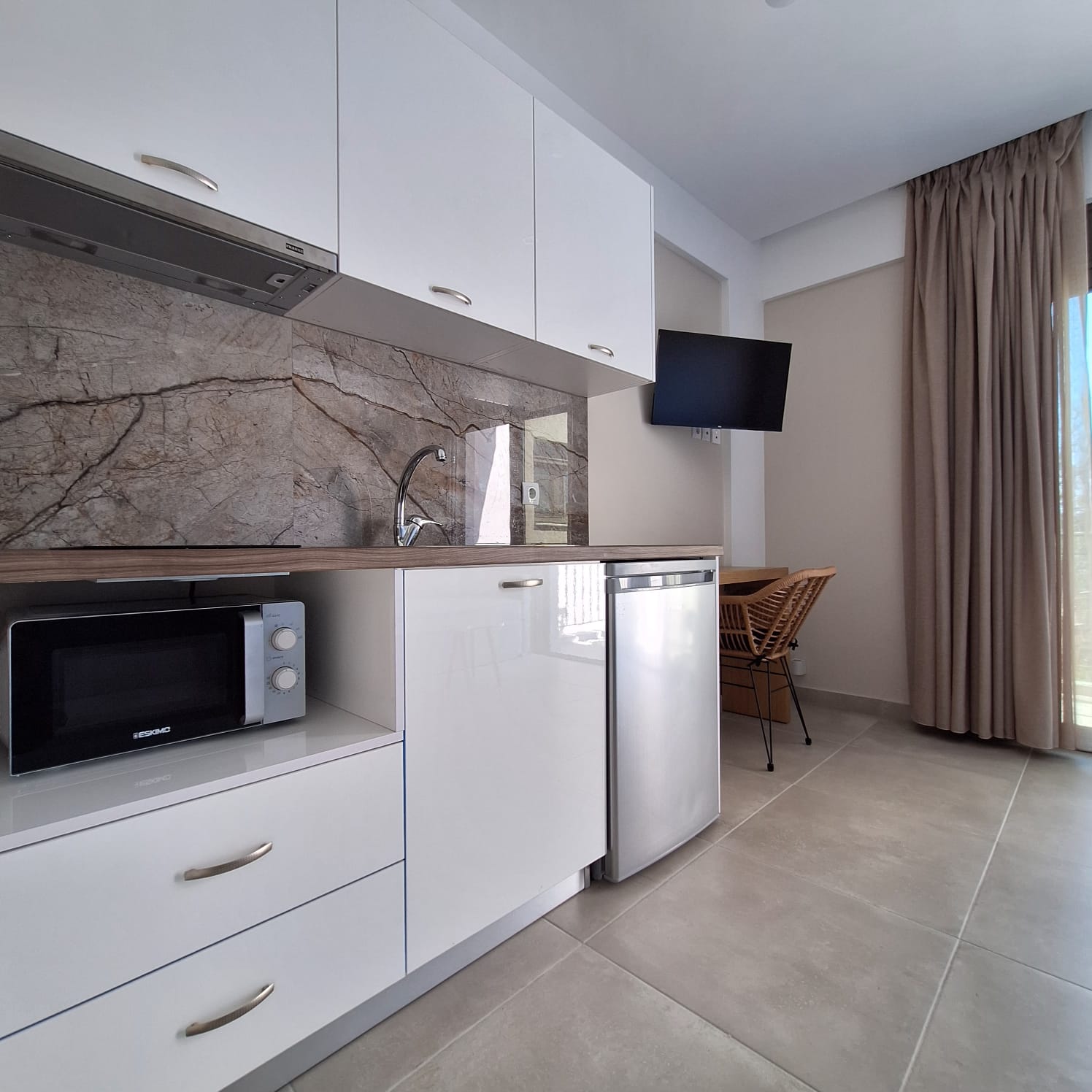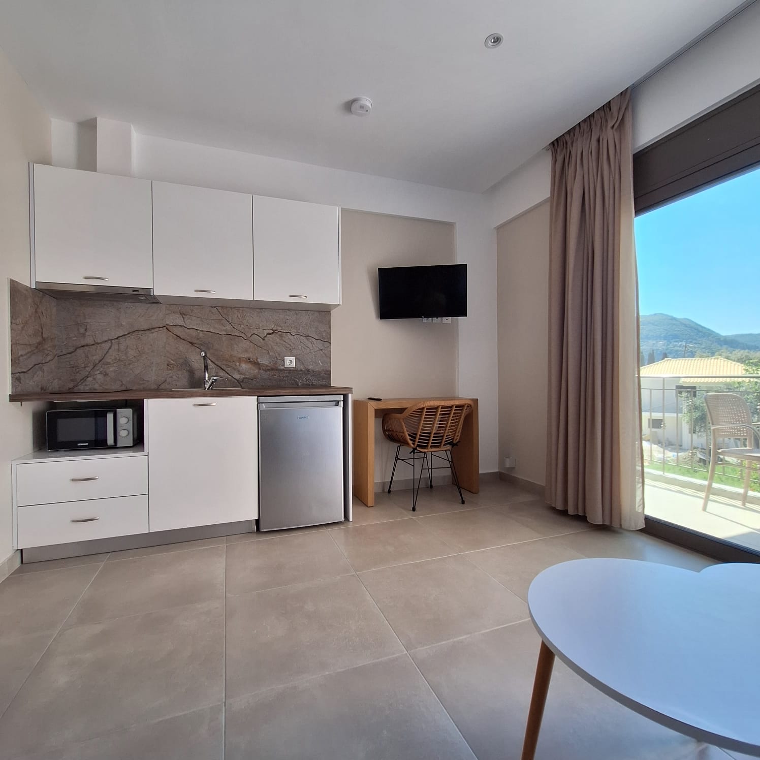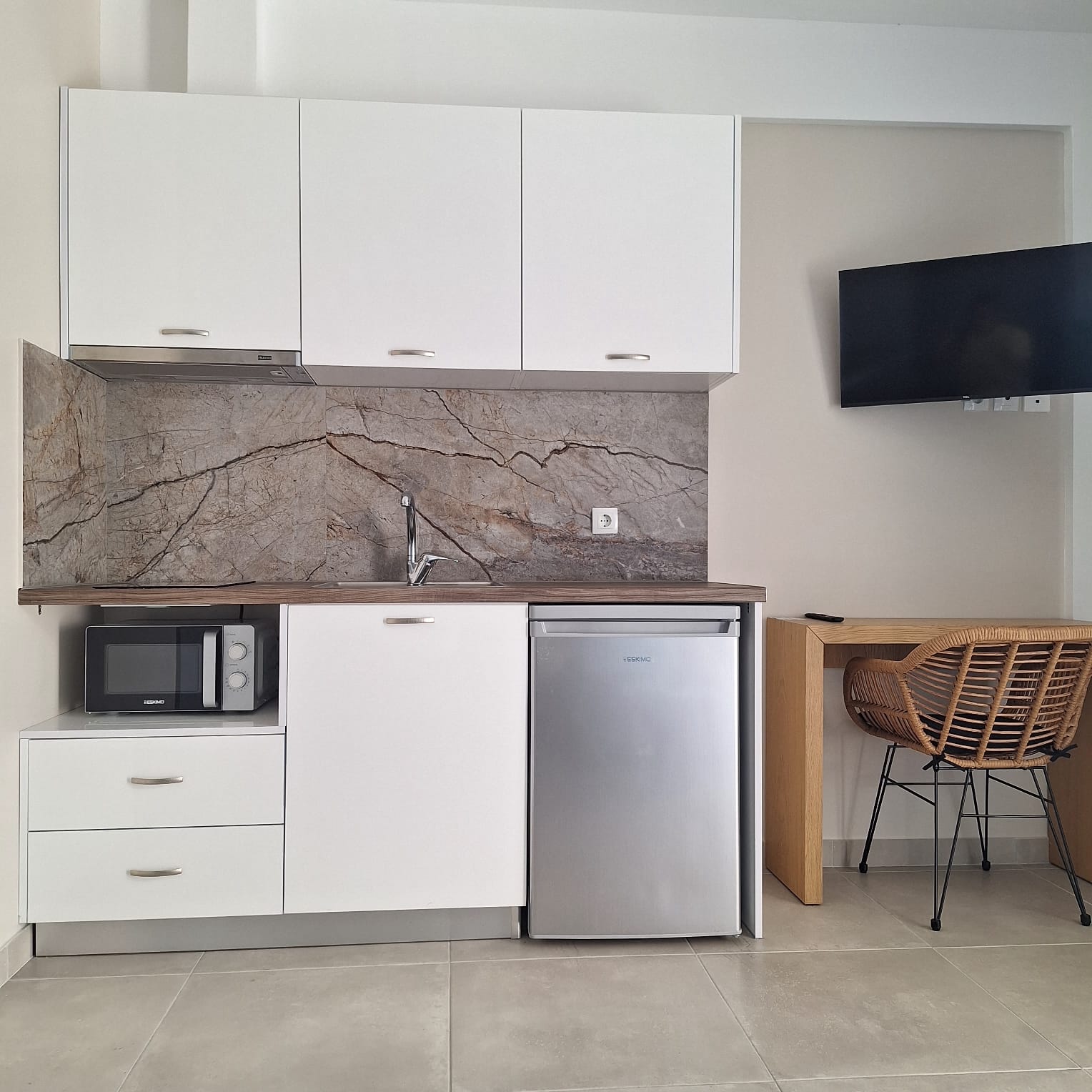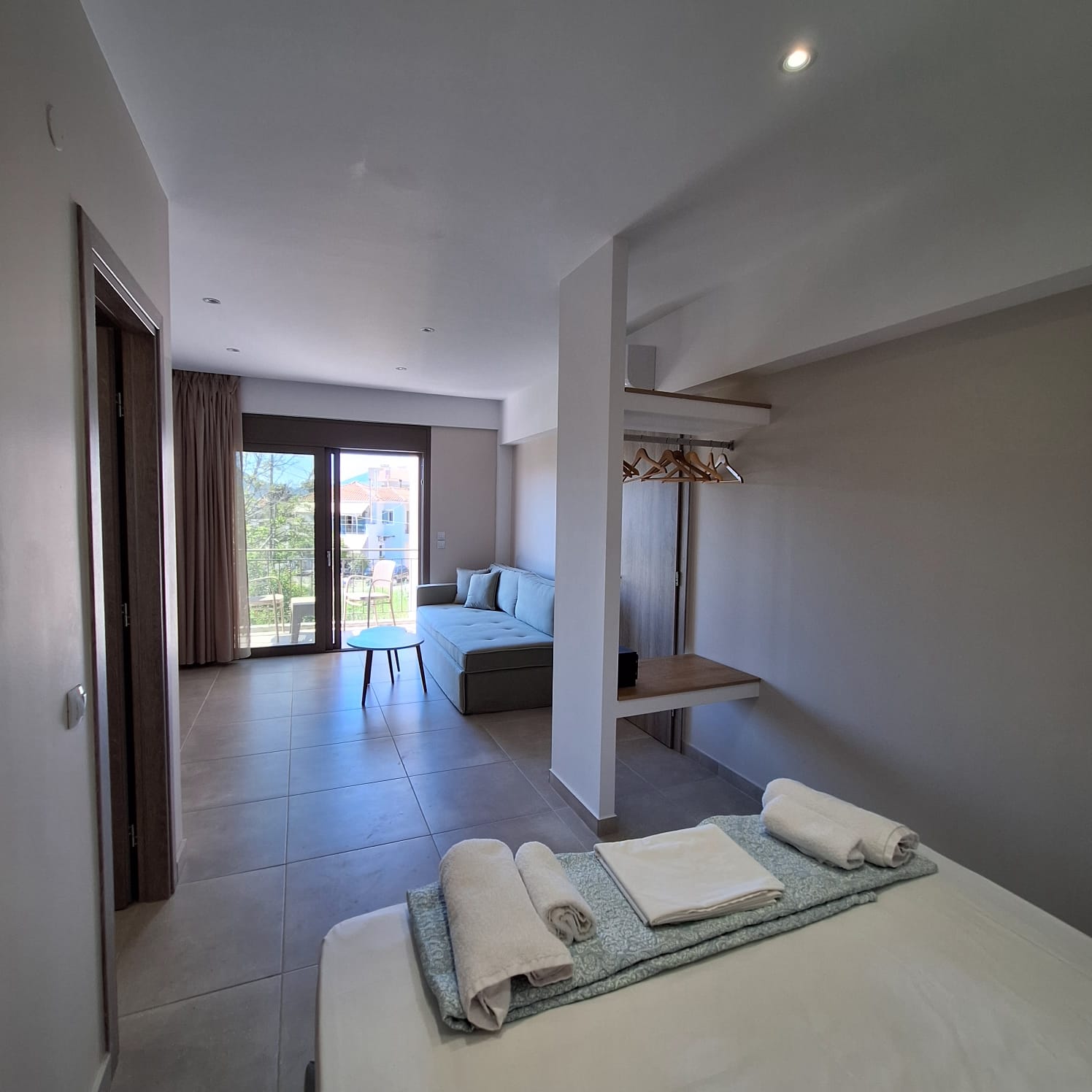 Step into our modern suite, thoughtfully designed to offer comfort, style, and convenience.This open-plan space features a fully equipped kitchen,  a comfortable double bed and a sofa-bed, balcony, air conditioning, complimentary WiFi, and free private parking.